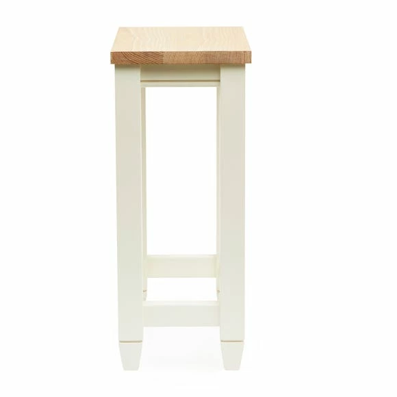 This stunning Churchgate Ivory Island Bar Stool is a strong, compact stool ideal for a breakfast bar seating area or kitchen island counter. Crafted from solid acacia frame and legs finished in a gorgeous white painted finish and MDF veneered oak tops, the rustic charm of this bar stool is a timeless addition in any home. The Churchgate Island Bar Stool pairs perfectly with the complementing items of the Churchgate line, but is versatile and stylish enough paired with other pieces within your home.
