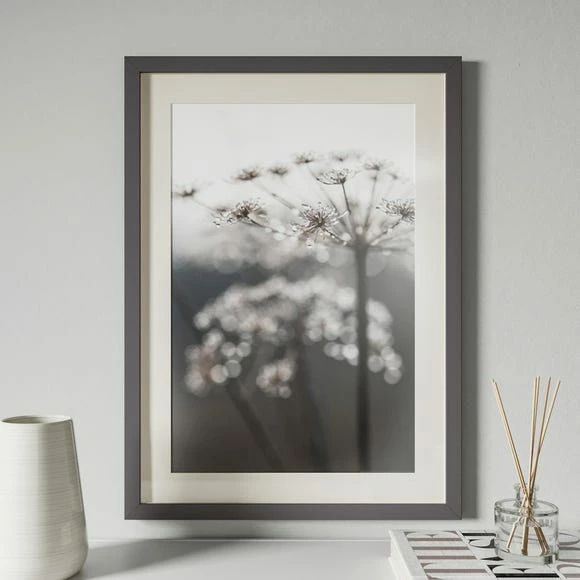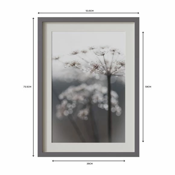 Jewel like droplets adorn this misty seed head, presented in a simple yet stylish grey satin finish frame and warm white mount. Frame, paper and mount all responsibly sourced and made in the UK.